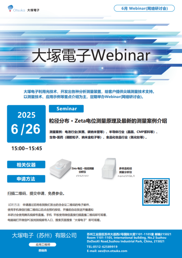 大塚电子的 Zeta 电位测量系统“ELSZ 系列”不仅可以测量溶液中胶体粒子的 Zeta 电位,也可以测量平板状、薄膜状样品的 Zeta 电位。通过这样的测量可以评价平板状样品的表面改质状态以及液体中粒子的吸着特性。本次研讨会将介绍其应用。