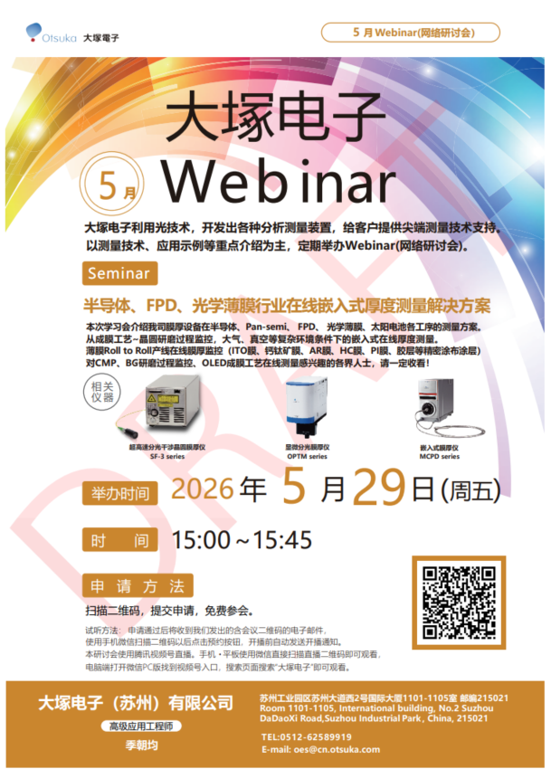本次学习会介绍我司膜厚设备在半导体各工序的测试方案。从成膜工艺~晶圆研磨过程监控。大气、真空等复杂环境条件下的嵌入式在线厚度评价。对CMP,BG研磨过程监控,OLED成膜工艺在线评价感兴趣的各界人士,欢迎收看。