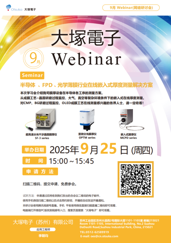 本次学习会介绍我司膜厚设备在半导体各工序的测试方案。从成膜工艺~晶圆研磨过程监控。大气、真空等复杂环境条件下的嵌入式在线厚度评价。对CMP,BG研磨过程监控,OLED成膜工艺在线评价感兴趣的各界人士,欢迎收看。