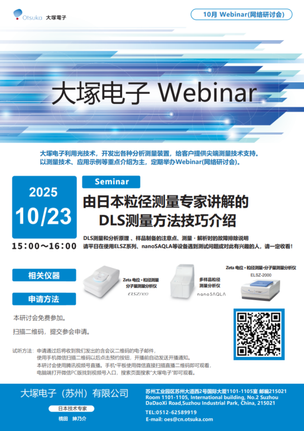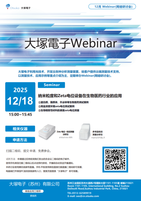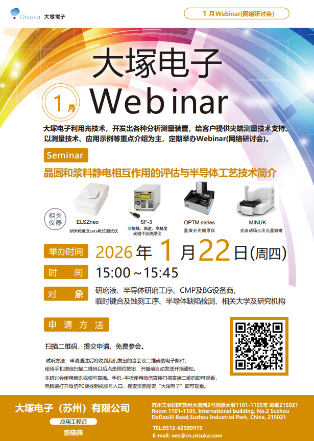 大塚电子的 Zeta 电位测量系统“ELSZ 系列”不仅可以测量溶液中胶体粒子的 Zeta 电位,也可以测量平板状、薄膜状样品的 Zeta 电位。通过这样的测量可以评价平板状样品的表面改质状态以及液体中粒子的吸着特性。本次研讨会将介绍其应用。
